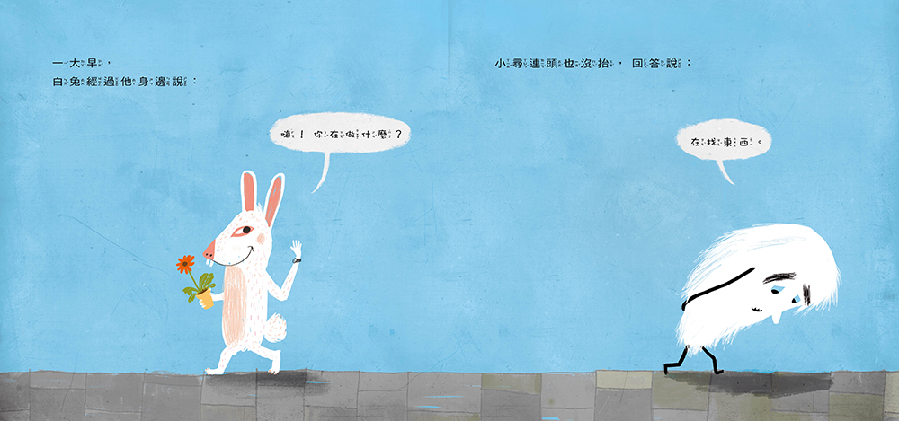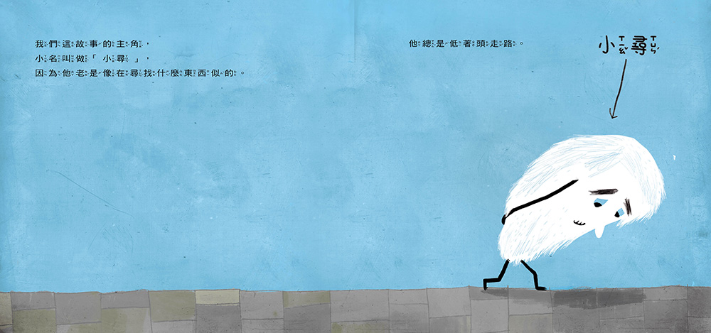 有一個名叫小尋的先生,他總是低著頭走路,好像永遠在尋找什麼東西似的,所以大家叫他小尋。從早到晚,不管任何人經過小尋身邊,總是會跟他打招呼,說:「嗨!你在做什麼?」。