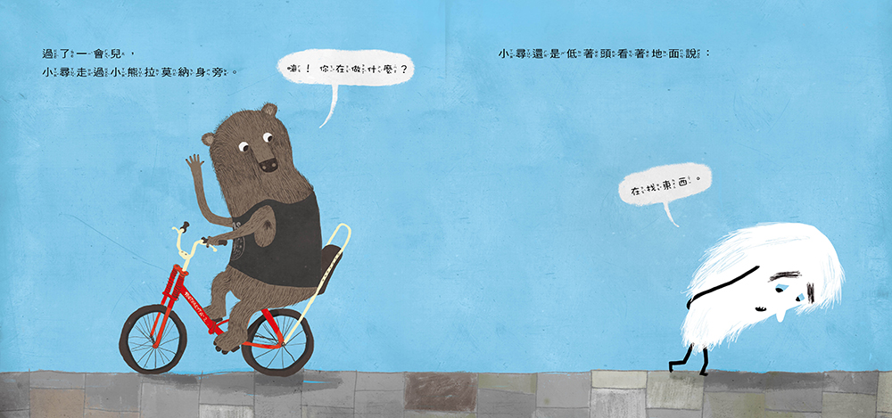 不只故事逗趣,相信孩子們看到小尋被小鳥拉屎在頭上那一幕,肯定笑翻!這本繪本的圖像表現也很精彩!當小尋低著頭時,他只看得到灰灰的地面,視野很狹隘且受限,整個畫面總是以淺藍底鋪陳出小尋的憂慮,一旦小尋抬起頭來,看見了其實原本就存在他身邊的熱鬧世界,整個畫面瞬間變得繽紛多彩了起來,每一個造型特殊的可愛動物都有屬於自己的顏色和特徵,各式不同的店家也把街景襯托得極其美麗。最後,小尋投入大家的活動中,讀者們更可以透過畫面的各種細節去搜尋這個世界的多樣與美麗。