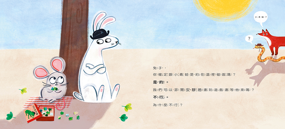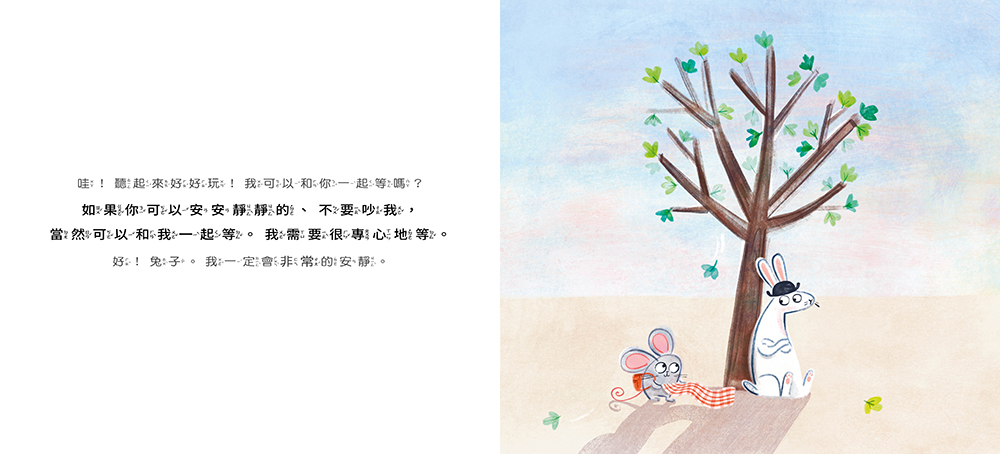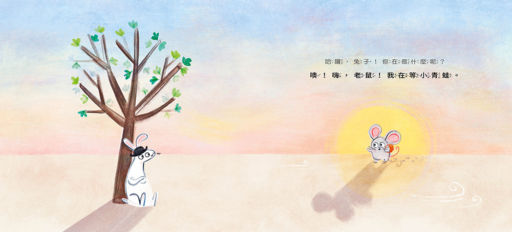 兔子一動也不動,老鼠好奇地問:「兔子,你在做什麼呢?」兔子說:「我在等小青蛙。這個爆笑又好玩的故事就從兔子的等待開始。老鼠覺得這可能是件好玩的事,於是要求加入。「如果你可以安安靜靜的、不要吵我,當然可以和我一起等。我需要很專心地等。」原來兔子為了等待小青蛙,什麼事都不做,也不說話,不看旁邊的其他事物,只是一直等、一直等⋯⋯