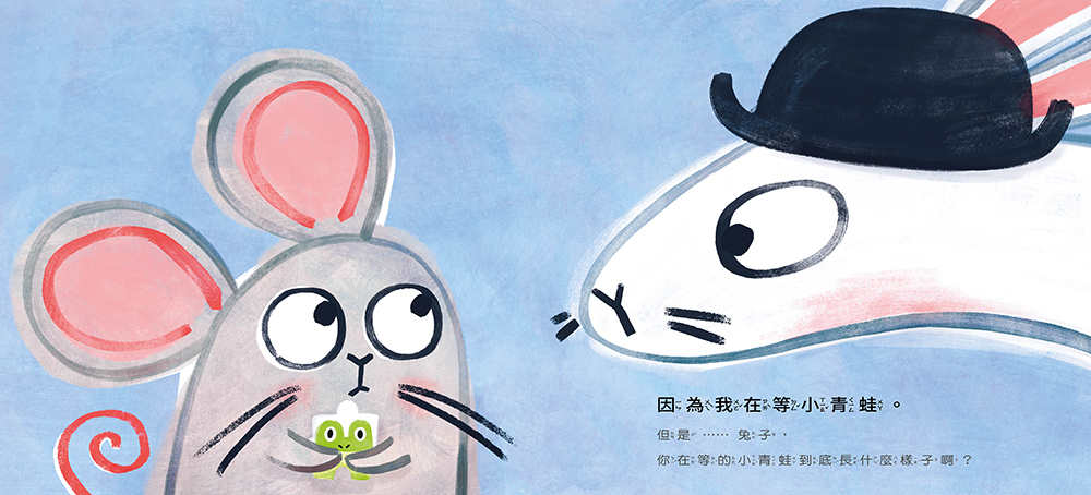 等了又等,還是不見小青蛙的蹤影,老鼠開始懷疑了,提出了一連串的疑問:小青蛙到底長什麼樣子啊?很高嗎?很多毛嗎?有特殊氣味嗎?兔子的回答讓人覺得其實他可能也不清楚小青蛙到底是何方神聖。在等待的過程中,旁邊有其他的小動物在玩遊戲、野餐、唱歌,在圖像上,小讀者們可以在書頁上看到小青蛙的身影其實無處不在,但是專心等待的兔子卻視若無睹,因為他說他要專心等待,他不能玩、不能笑,當然也不能加入大家玩耍的行列。