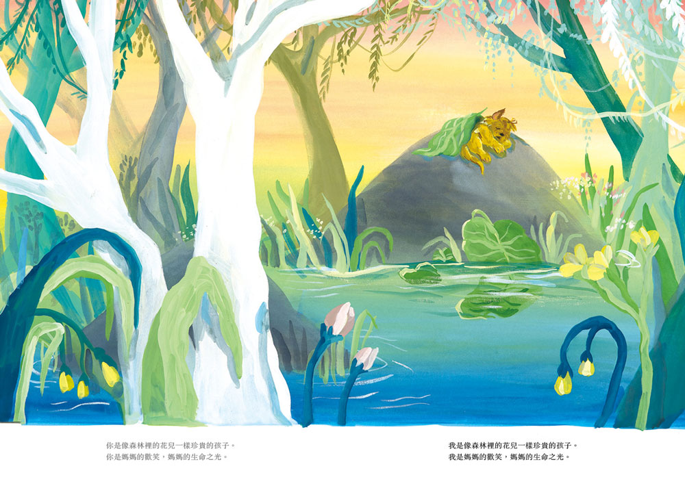 這是一本很特殊的繪本書寫方式。整本書都以跨頁的形式,一左(媽媽的心聲)一右(孩子的心聲)雙視角地描繪出親子關係在歲月及孩子成長的不同階段中細微的互動樣貌。