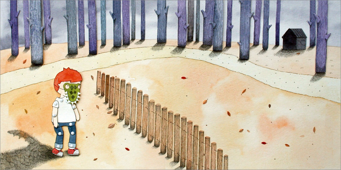 書裡的孩子其實是很害怕面對人群的(他可能時常感受到來自於他人的不了解),於是,他總是戴著畫有兇猛鱷魚的面具出門,一見到人,便發出鱷魚咬人的聲音嚇人,處處搞破壞,戴著面具的他,眼中所見的其他人也都戴著可怕的面具。別人視他如怪獸,但怎知他只是一個內心感到無比恐懼害怕的小怪獸哪?