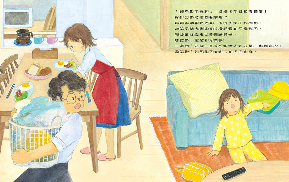 故事一開始,小莉便解釋了「對不起可樂餅」的名稱由來!為什麼會有「對不起可樂餅」這個超級奇怪的菜名呢?原來是媽媽非常喜歡做菜,但是如果工作太忙,她就沒辦法做這道很費時間的可樂餅了。所以在她能抽出時間的時候,她就會一邊捏著可樂餅,一邊把「之前一直很忙的對不起心情」也包進去。這就是「對不起可樂餅」的名稱由來。這道菜其實隱藏著媽媽的愧疚啊!
