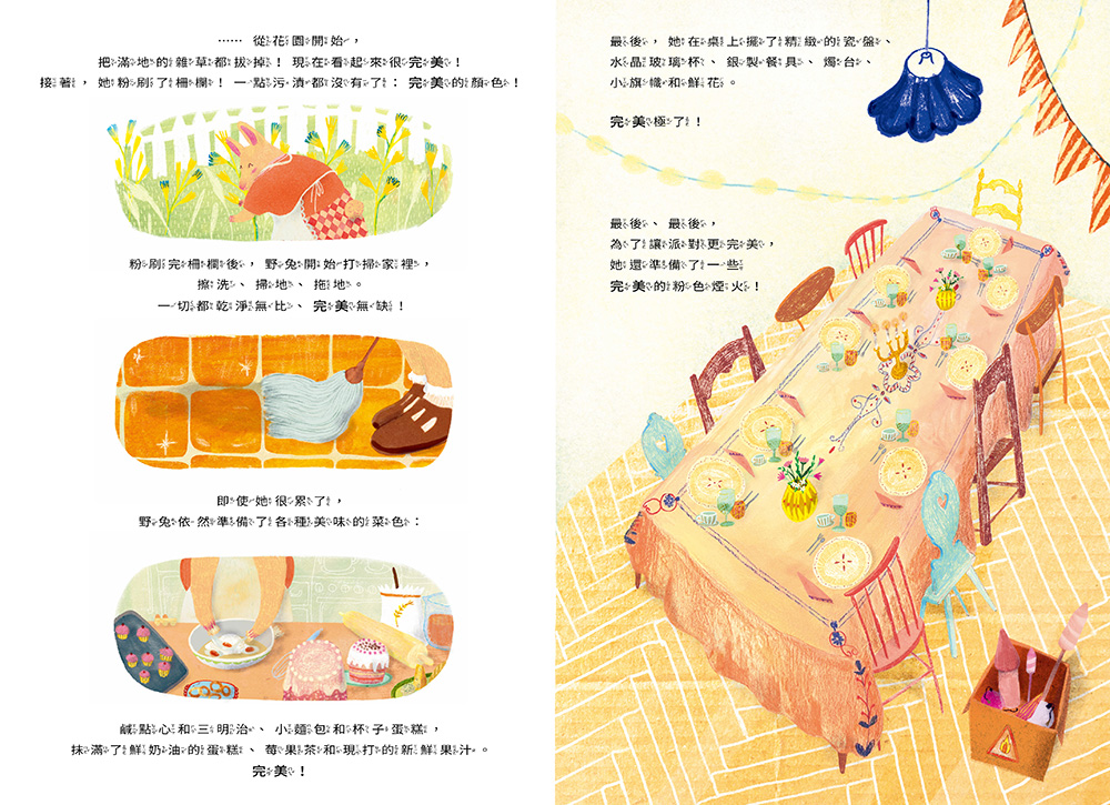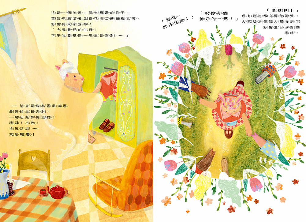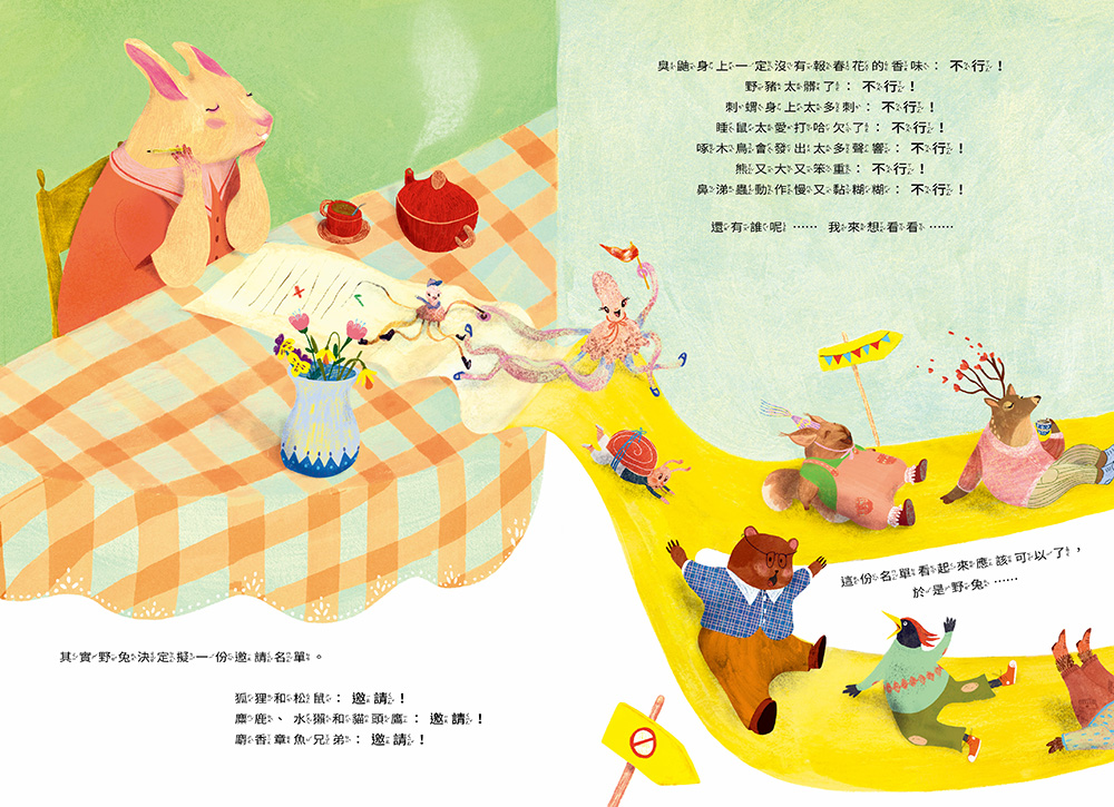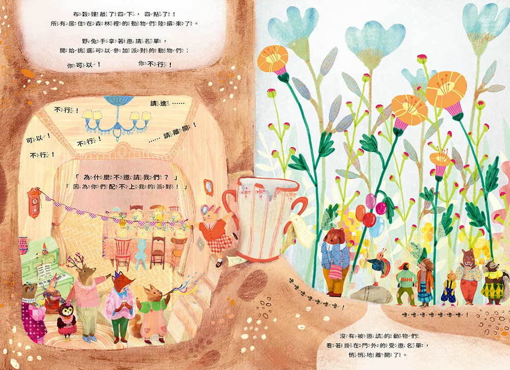 除了挑選客人之外,從裝飾品到餐點,野兔把一切都安排得很完美!誰知道那些沒受邀的動物們在一棵老樹下辦起了隨興的派對,所有東西都是臨時隨便來的,但他們開開心心地唱歌跳舞,沒有華麗的布置,卻快樂極了。反觀野兔這邊號稱完美的生日派對,因為野兔規定了一大堆規矩,大家都覺得很無聊。於是,野兔的客人一個個溜出去參加那些沒被邀請的動物的派對⋯⋯