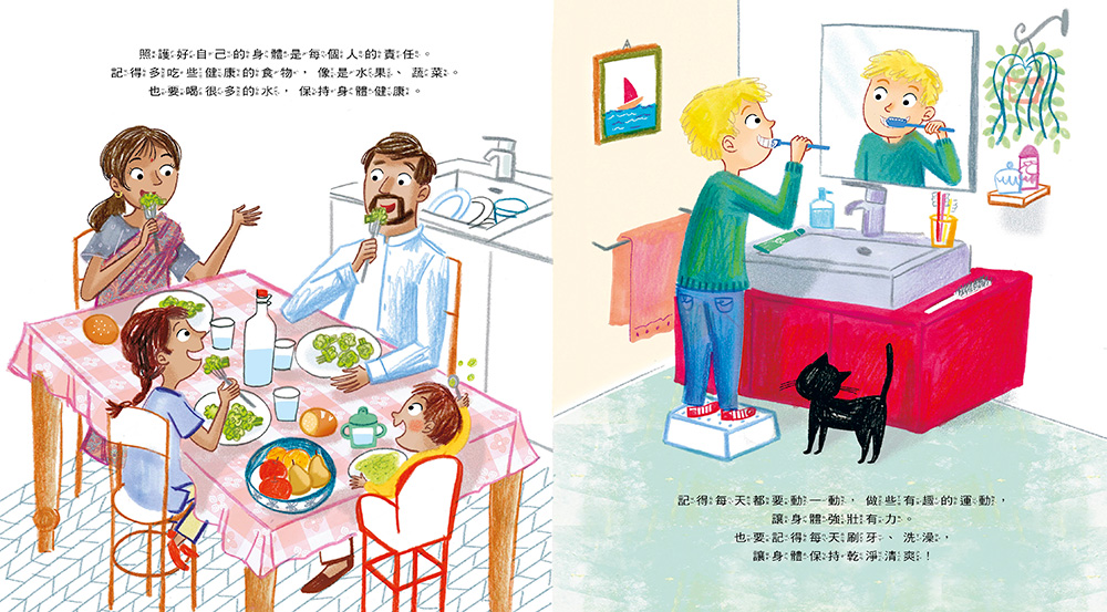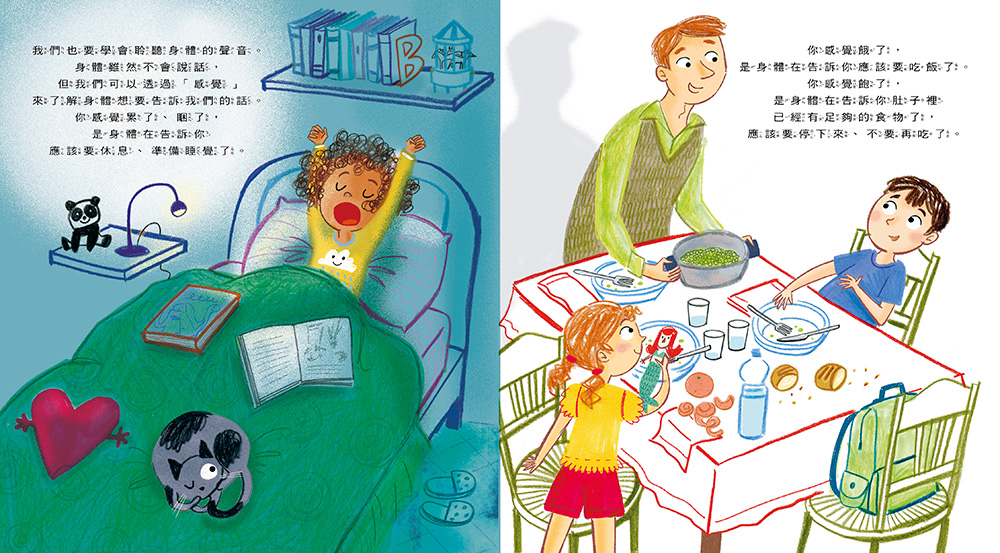 首先,告訴孩子們身體幫助我們完成很多事,跑啊跳啊,以及所有我們想要完成的事都得靠身體來幫忙。同時告訴孩子健康的重要性,我們必須要吃健康的食物,比如蔬菜和水果,也要喝很多水,維持身體健康。再來,更重要的是教孩子辨識身體的感受,如果有人觸摸你而讓你感覺不舒服,那麼,要相信你的感覺,及時向信任的大人求救。身體的感受很重要。當我們被擁抱、被親吻的時候,大部分的時候都會感到很幸福。但是,有時候我們並不想要被擁抱或是被親吻,就算是和你很親近的人或是你愛的人,你也有權利拒絕他們的肢體接觸。