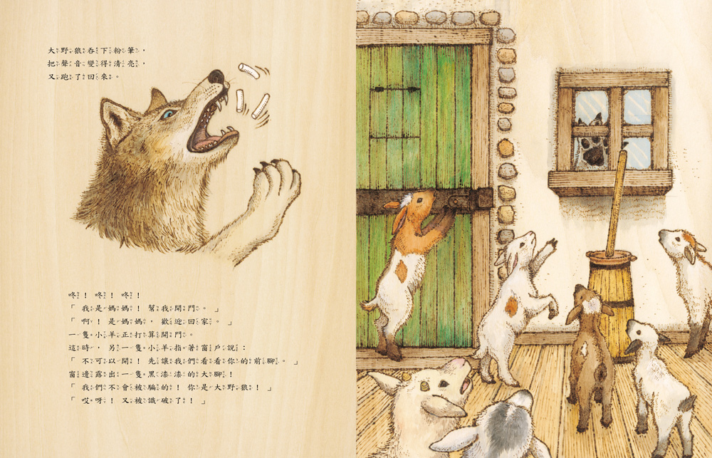 沒想到媽媽才離開沒多久,心懷不軌的大野狼便假扮成羊媽媽來敲門了!不過,聰明的小羊們才不會輕易讓牠得逞,因為小羊們知道,媽媽的聲音絕對沒有那麼低沉,甚至還機靈地要對方先露出前腳給牠們確認。